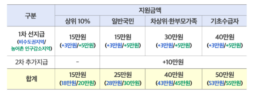 | 1차 | 전 국민에게 1인당 15만원(차상위 30만원, 기초 40만원) 우선 지급 ※ 비수도권지역(서울 ·인천 ·경기, 농어촌 인구감소지역 제외)1인당 3만원 추가 지원 ※ 농어촌 인구감소지역(84개 시 ·군)은 1인당 5만원 추가 지원 |