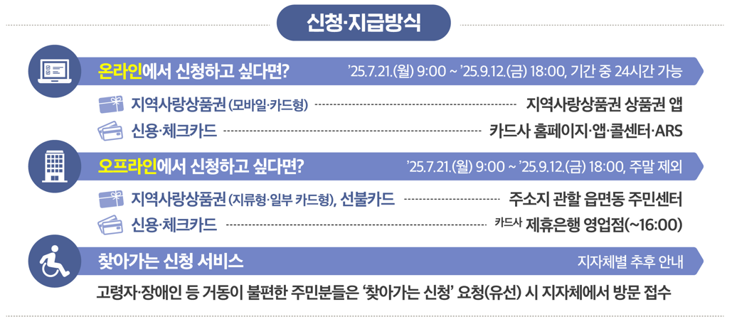 카드사・지역사랑상품권 홈페이지, 앱, 콜센터, ARS오프라인 : 제휴은행 영업점, 읍면동 주민센터
